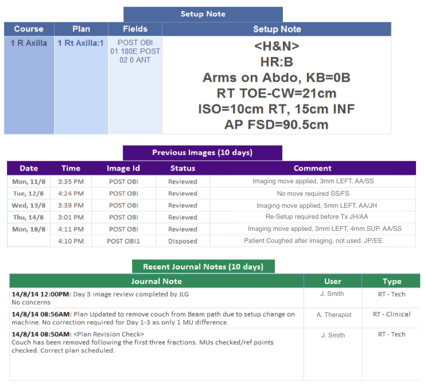 The Daily Treatment Summary Report was designed for treating radiation therapy staff to; improve the visualisation of historical treatment events (images, treatment notes and journal entries) as well as the communication of setup issues between fractions. The report provides an efficient summary of the patients treatment information and can be viewed by staff away from the treatment console, in a quality assurance or preparation capacity well before the patients treatment appointment. The customisable report can include;
